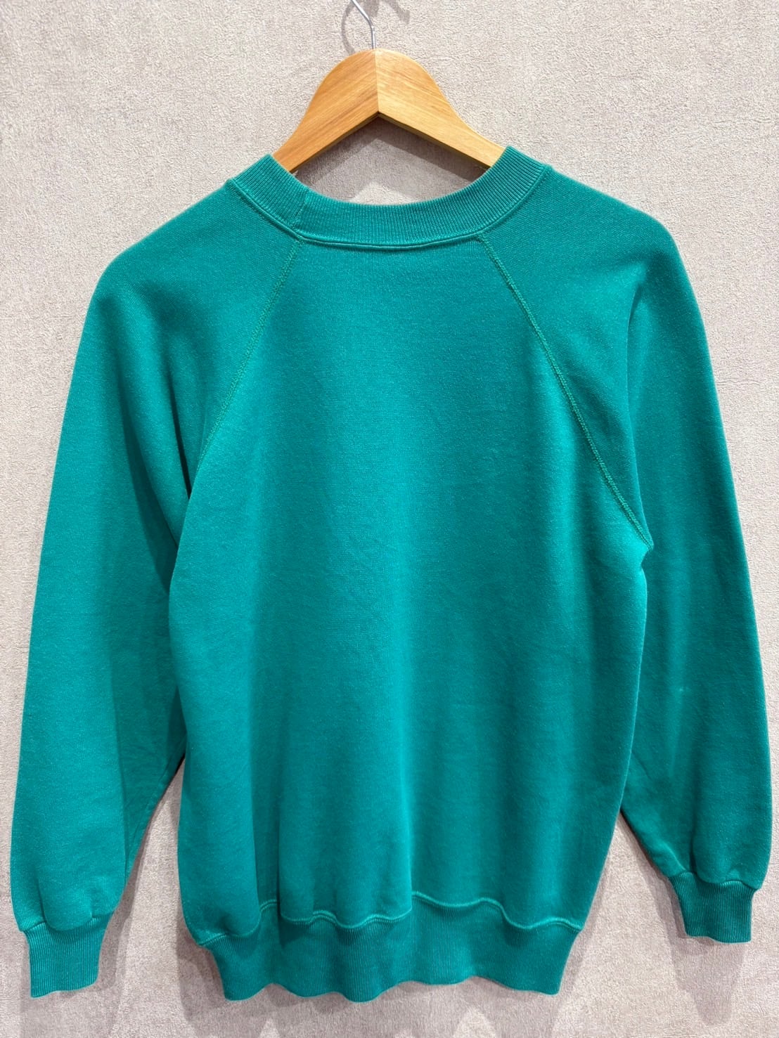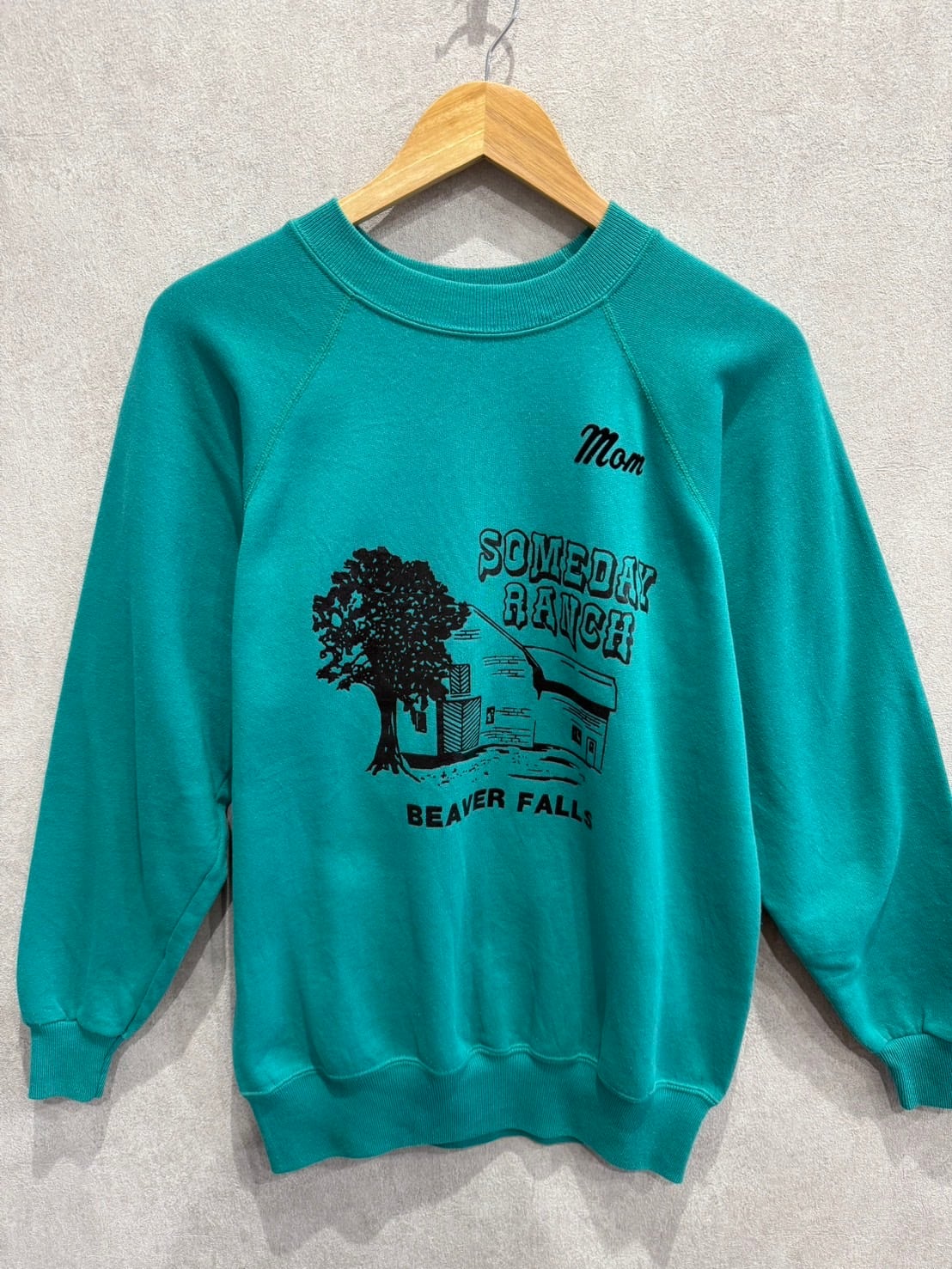 Hanes製のヴィンテージスウェットで、ボディカラーはティールグリーンです。フロントには「Someday RANCH」と「BEAVER FALS」の文字と、家と木が描かれたグラフィックがプリントされていておすすめです。
