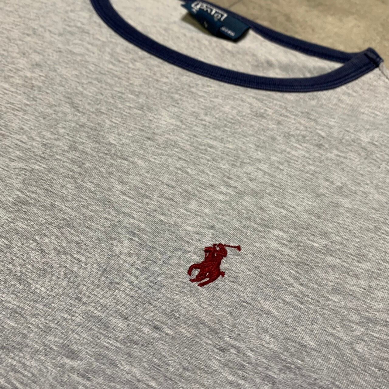 RalphLauren ラルフローレン ワンポイント リンガーTシャツ 半袖Tシャツ スモールポニー刺繍 サイズ L グレー ライトグレー ネイビー