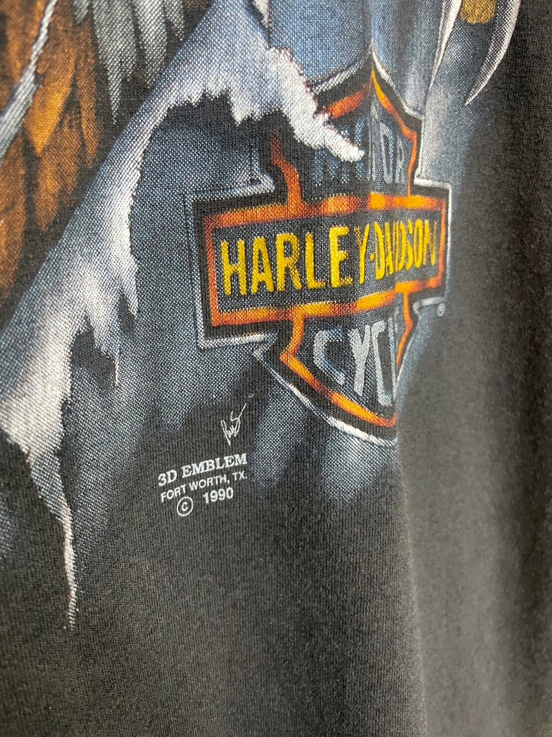 3D EMBLEM HARLEY-DAVIDSON ハーレーTee ブラック/フェード L ヴィンテージ シングルステッチ 90年代 オフィシャル コピーライト有 イーグル 両面プリント バイカー 企業系 古着 90年代 90s