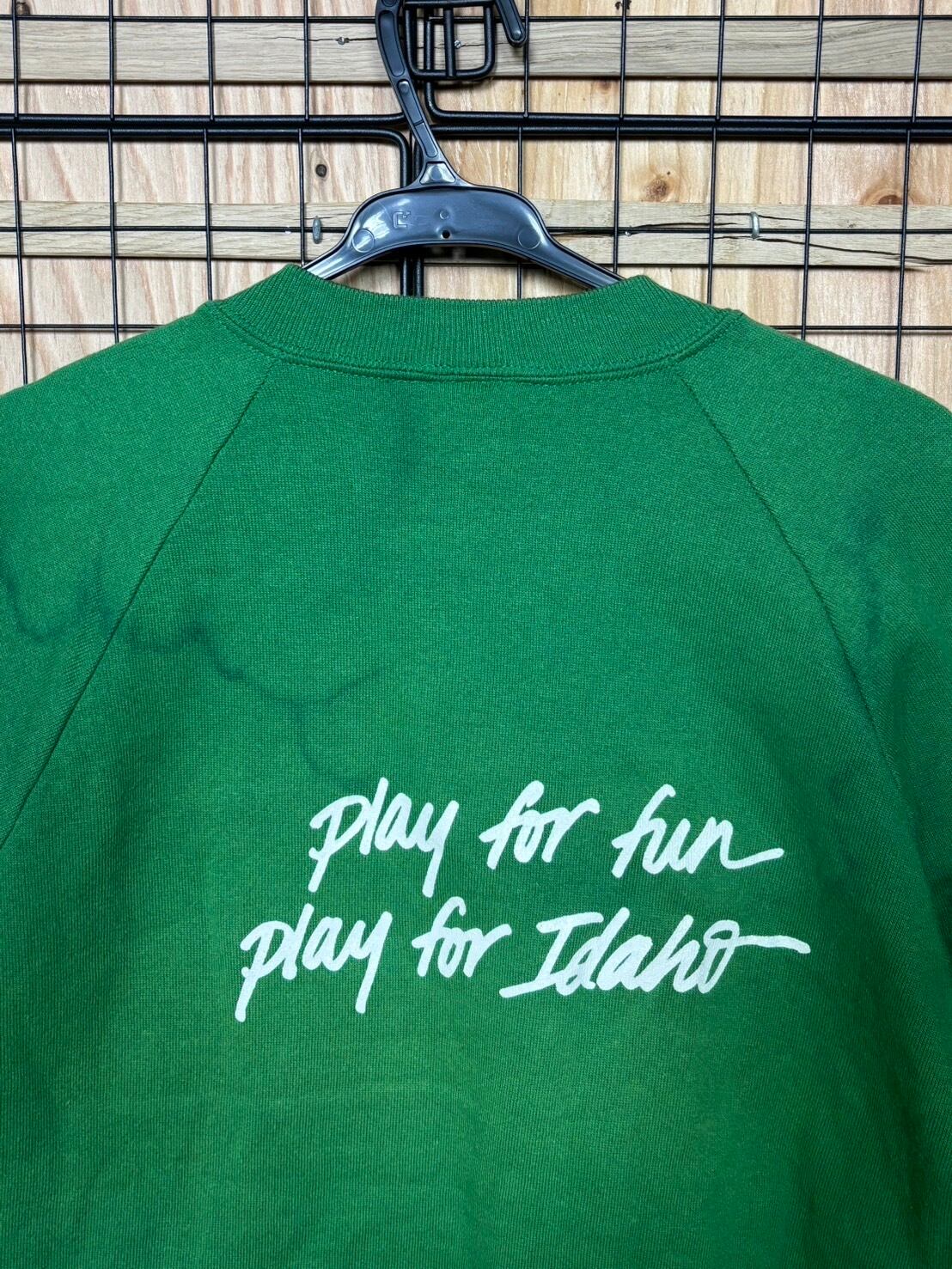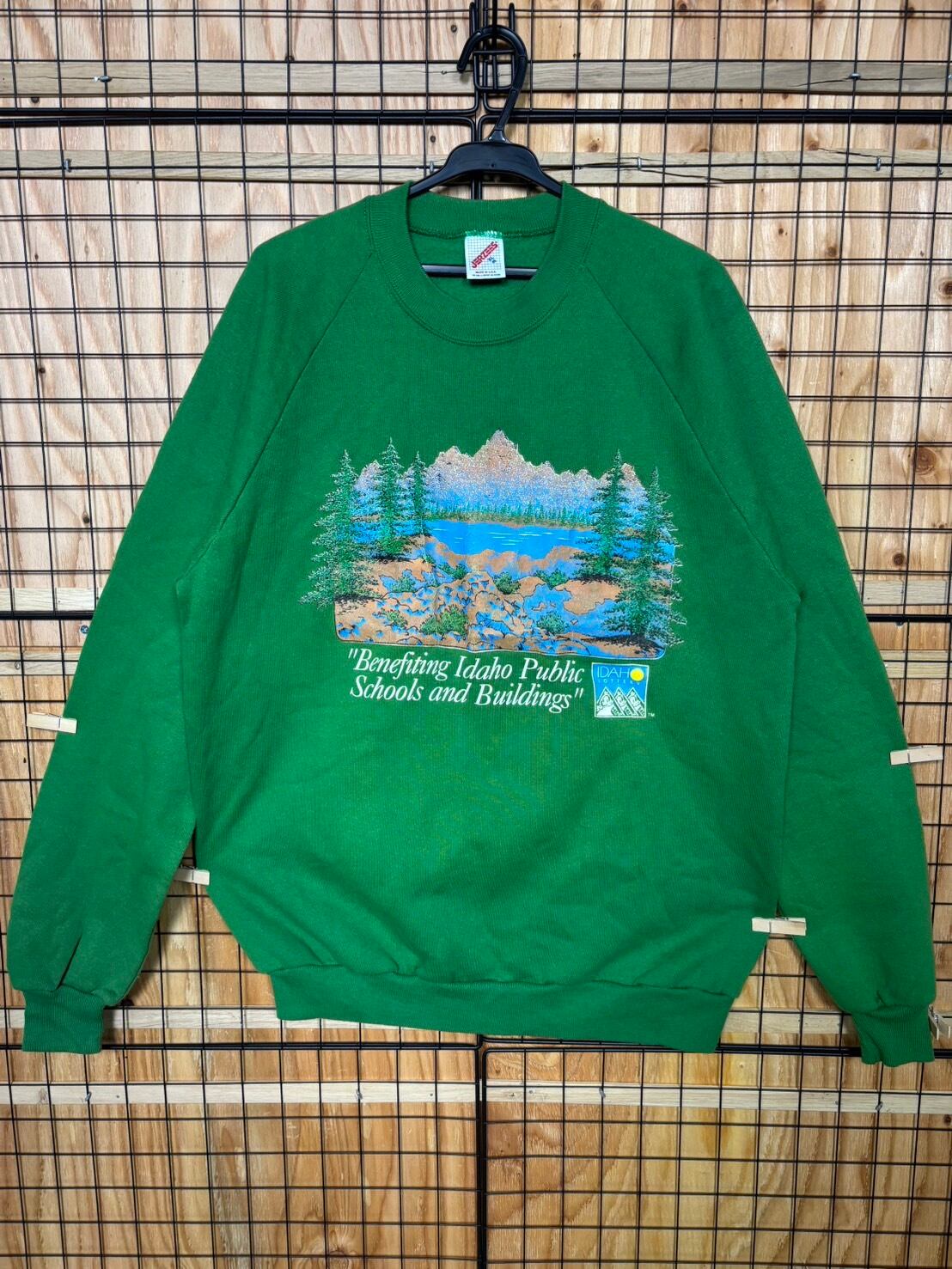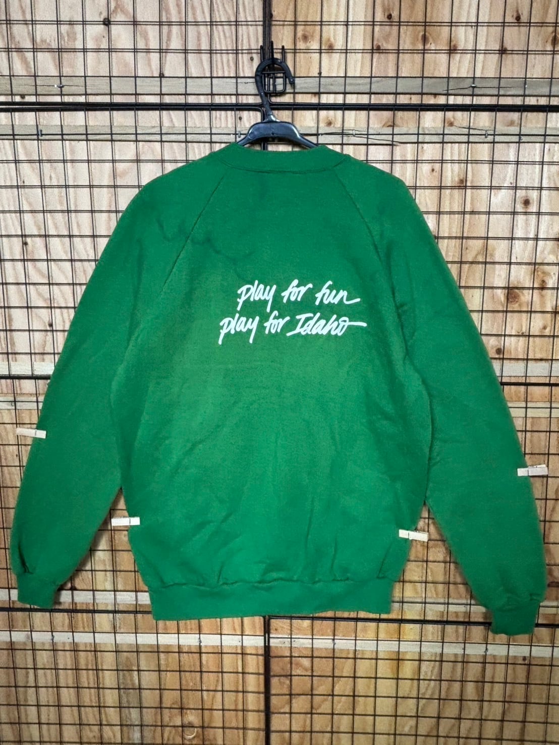 JERZEES ジャージーズ スウェット グリーン XL フロントデザイン 企業系 プリント IDAHO バックプリント ヴィンテージ シティ アウトドア 古着 90年代 80s〜90s
